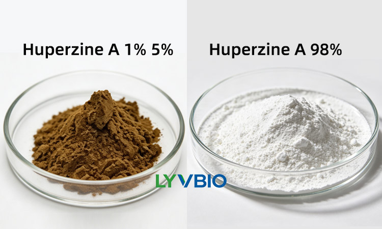 Huperzine-A 1% and Huperzine A 99% differ in concentration, sourcing, and applications. Huperzine A 1 is typically derived from the Huperzia serrata plant and blended with carriers, making it suitable for supplements or formulations requiring lower concentrations. In contrast, Huperzine A 99% is a highly pure, concentrated form. Due to the high cost of extracting such purity from natural sources, the mass production of Huperzine A 99% is achieved through chemical synthesis, making it commercially viable. The 1% version caters to consumer-grade products, while the 99% version is ideal for industrial, pharmaceutical, or research applications.
